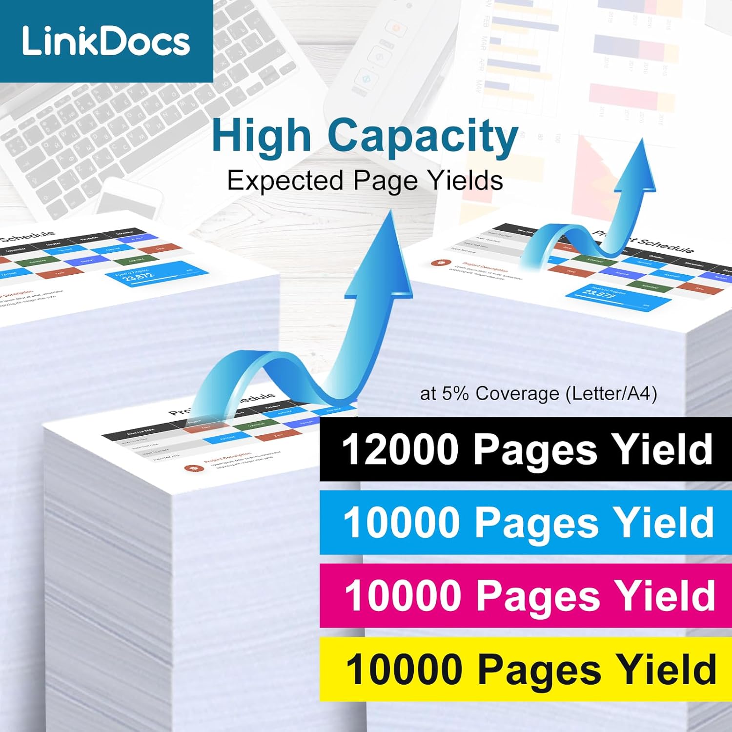 - High Page Yield: Each black toner cartridge yields up to 12,000 pages, and each color toner yields up to 10,000 pages, making it perfect for high-volume printing needs.